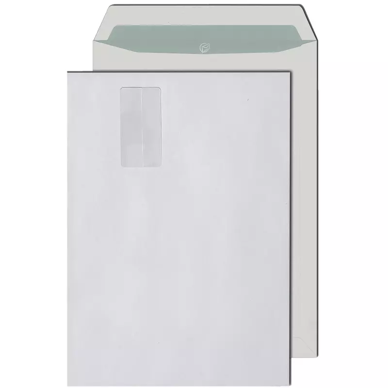 Adressfeldtasche DIN B4, 250 x 353, haftklebend, weiß, 120 g/m², mit Fenster 55 x 90 mm, für Adres sträger A5, "Hier öffnen", Pack: 250 Stück