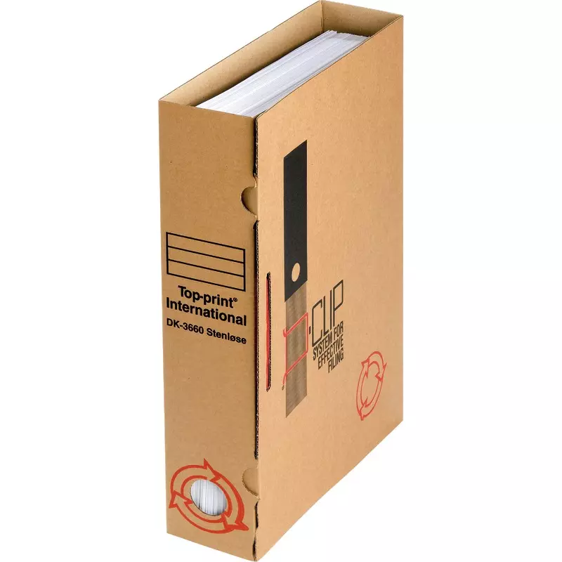 Bündelungsbügel D-Clip durch die vorgestanzte Lochung schieben, den Inhalt aus Ordner oder Hefter entnehmen, bündeln– Ordnerseitenteile umklappen – fertig.