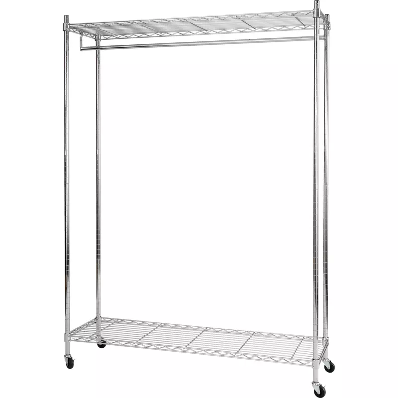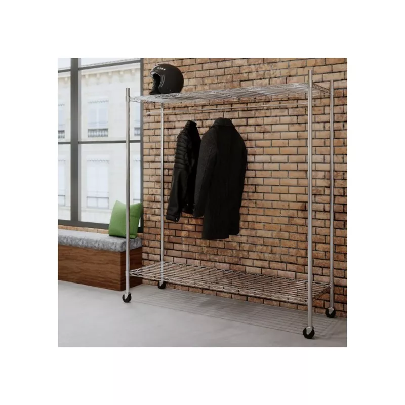 Dieser elegante Garderobenständer stellt Ihre Bedürfnisse zufrieden. Mobil dank Rollen. Einfaches, funktionales Design mit 2 Ablagen. Hohe Kapazität von 26 Aufhängern. Taschen und Accesoires können auf den beiden Ablagen verstaut werden. · Farbe: chrom · Werbliche Produkttypbezeichnung: Garderobenständer · Maße: 89 x 168 x 35 cm (B x H x T) · max. Tragfähigkeit: Kleiderstange: 50 kg · Anzahl der Böden: 2 Böden · Tragkraft pro Boden: 70 kg · Anzahl der Lenkrollen: 4 Lenkrollen, 2 feststellbar · Montageart bei Lieferung: zerlegt · Gewicht: 8,2 kg · Werkstoff: Metall, verchromt
