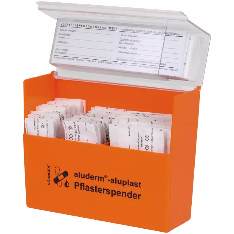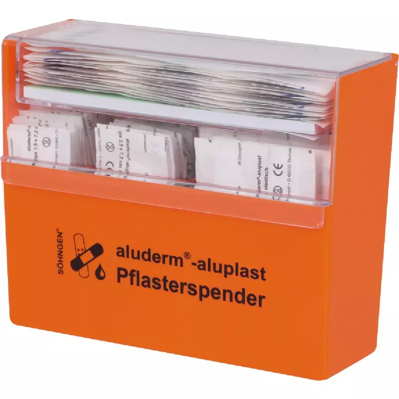 Gefüllt mit 90 aluminiumbedampften aluderm®-aluplast Wundpflastern in 4 verschiedenen Abmessungen. Auch bei empfindlicher Haut oder Pflasterallergie gut geeignet. Jede Pflastersorte ist übersichtlich in einem eigenen Fach untergebracht und somit stets griffbereit und einfach nachzufüllen. Lieferung inkl. Wandhalterung.