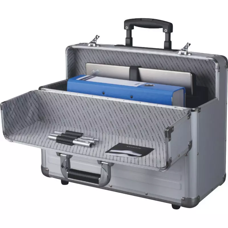Formvollendeter Pilotenkofferaus edlem, glattem Aluminium. Innenaufteilung: Laptopfach, drei Schreibgeräteschlaufen und zwei Kartensteckfächern im Deckel.