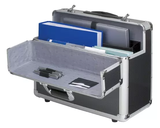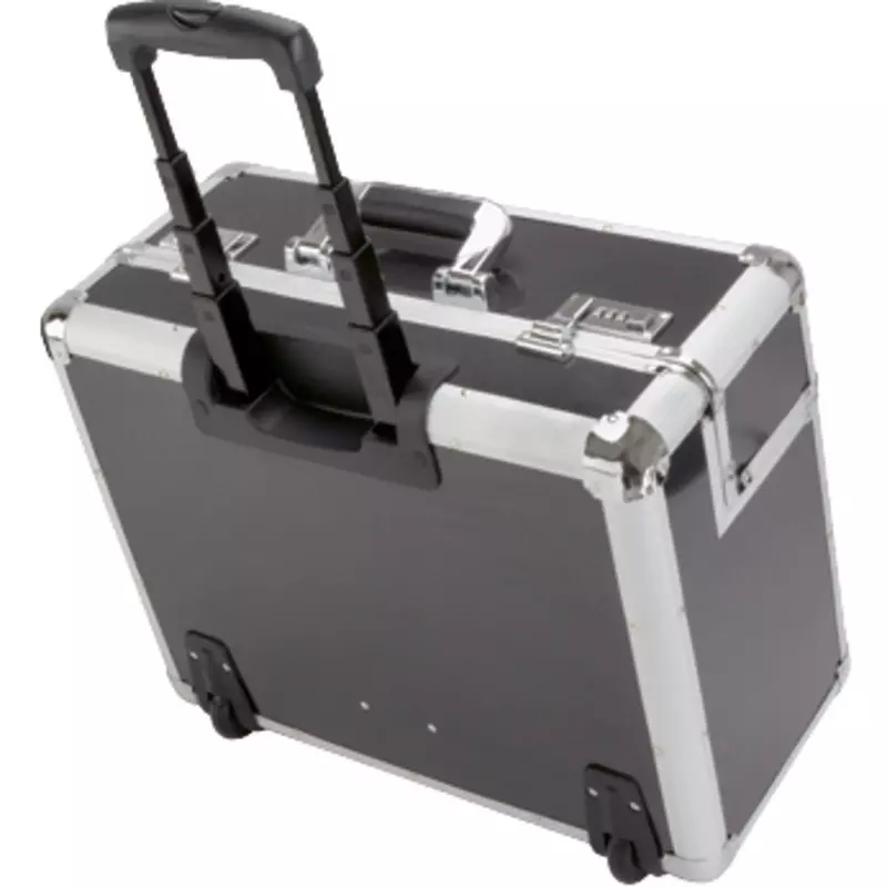 Pilotenkoffer im „CARBON“ Look, integriertes Trolleysystem, verstärkte Kanten, Heavy-Duty-Griff, Skaterrollen, zweiZahlenkombinationsschlösser.