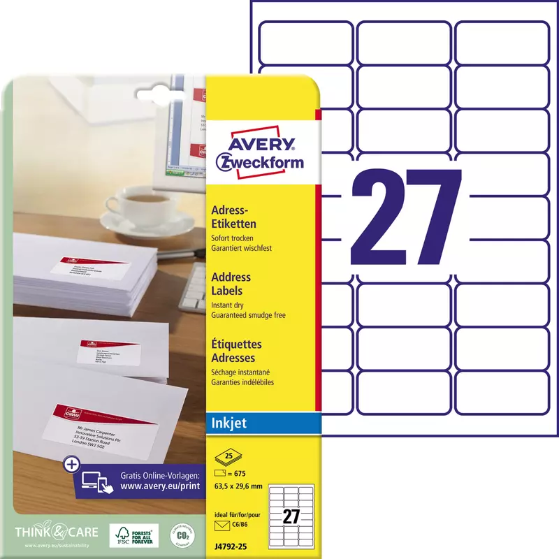 Etiketten je Blatt: 27 Etik./Bl. · Anzahl der Blätter je Packung:
