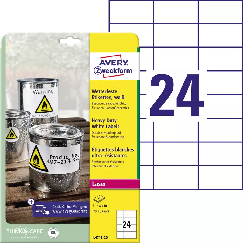Die reiß- und wasserfesten Folienetiketten sind deutlich strapazierfähiger als Papier-Etiketten, öl-, schmutz-, UV-beständig, seewasserfest und abwaschbar. Ideen drucken - einfach & professionell: mit Etiketten von Avery Zweckform können Sie den kostenlosen Online Etiketten-Designer unter www.avery.eu/print nutzen. Gestalten Sie Ihr Etikett mit der Software komplett selbst, verwenden Sie eine der Design-Vorlagen zu zahlreichen Themen, die Sie individuell anpassen können oder laden Sie Ihr fertiges Design hoch und drucken anschließend standgenau aus. So schnell und einfach sorgen Sie für einen professionellen Auftritt. · UV-beständig: Ja · ölbeständig: Ja · Temperaturbereich: -20 bis +80 °C · umlaufender Rand vorhanden: Ja · abgerundete Ecken vorhanden: Ja · Verwendung für Druck- oder Schreibgerät: Laserdrucker, Farblaserdrucker, Kopierer · Werkstoff: Polyester · PVC-frei: Ja · Farbe: weiß · Anzahl der Etiketten je Blatt: 24 Etik./Bl. · Werbliche Produkttypbezeichnung: Folienetikett · Anzahl der Blätter je Packung: 20 Bl./Pack. · Anzahl der Etiketten je Packung: 480 Etik./Pack. · Maße: 70 x 37 mm (B x H) · Anordnung auf: A4-Blatt · selbstklebend: Ja · wieder ablösbar: Nein · wetterfest: Ja · wasserfest: Ja · reißfest: Ja · witterungsbeständig: Ja