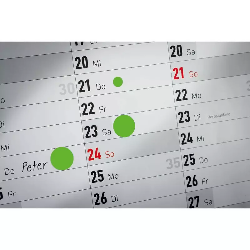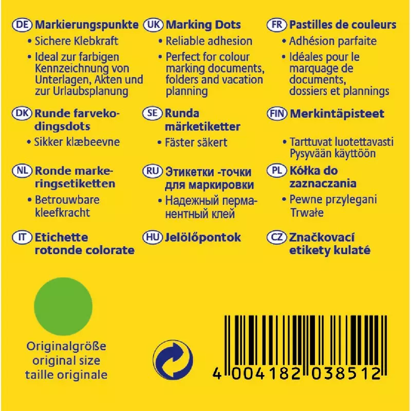 Die grünen, selbstklebenden Markierungspunkte 3851 mit einem Durchmesser von 10 mm von AVERY ZWECKFORM werden in einem handlichen Spender angeboten. Sie sind ideal zum Kennzeichnen, Ordnen, Organisieren, Terminieren und Planen.