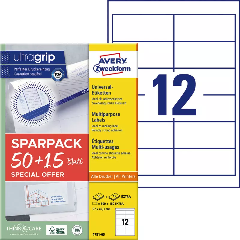 Qualität vom Etiketten-Experten: Mit 15 Blatt EXTRA-Inhalt! Die weißen Universal-Etiketten 4781-65 im Sparpack im Format 97 x 42,3 mm von Avery Zweckform haften mit starker permanenter Klebkraft absolut zuverlässig auf Papier, Karton, Glas und vielen gängigen Kunststoffen. Sie sind die Premium-Lösung zur Beschriftung von Unterlagen, Dokumenten und vielem mehr in Office und Home Office oder auch privat. Zum Adressieren von Briefen ist das Format besonders geeignet, auch für die Nutzung der INTERNETMARKE der Deutschen Post oder der Webstamp der Schweizer Post (600 Etiketten/Pack + 180 Etiketten EXTRA).
