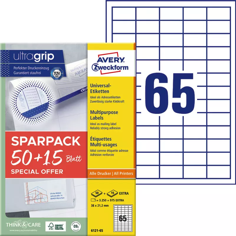 Qualität vom Etiketten-Experten: Mit 15 Blatt EXTRA-Inhalt! Die weißen Universal-Etiketten 6121-65 im Sparpack im Format 38 x 21,2 mm von Avery Zweckform haften mit starker permanenter Klebkraft absolut zuverlässig auf Papier, Karton, Glas und vielen gängigen Kunststoffen. Sie sind die Premium-Lösung zur Beschriftung von Unterlagen, Dokumenten und vielem mehr in Office und Home Office oder auch privat. Zur Nummerierung von Gegenständen ist das Format besonders geeignet (3.250 Etiketten/Pack + 975 Etiketten EXTRA).