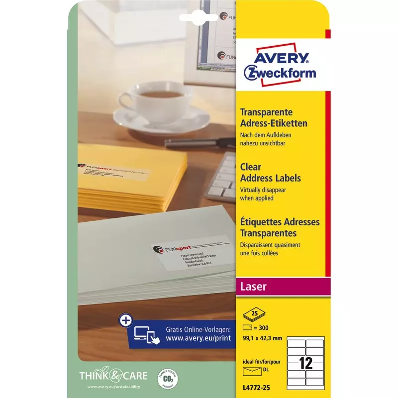 Produktinformationen "AVERY® Zweckform Adress-Etiketten L4772-25, transparent, B x H: 99,1 x 42,3 mm, Pack: 300 Stück"