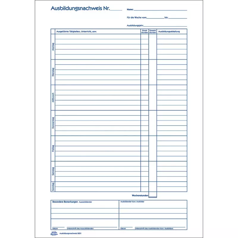 Der Ausbildungsnachweis 2831 von AVERY ZWECKFORM im DIN A4 Format eignet sich ideal als Berichtsheft zur wöchentlichen Dokumentation. Die Auszubildenden können die ihnen aufgetragenen Aufgaben vollständig und wahrheitsgemäß ausfüllen. Der Ausbildungsnachweis in Heftform wird zudem von der IHK anerkannt. Das Berichtsheft beinhaltet 28 Blatt, 1 Woche je Seite, aufgeteilt in Ausbildungstage und -stunden. Die Ausbildungsnachweise und Berichtshefte von Avery Zweckform sind zuverlässige, bewährte Hilfen für die Ausbildung und Personalwesen.