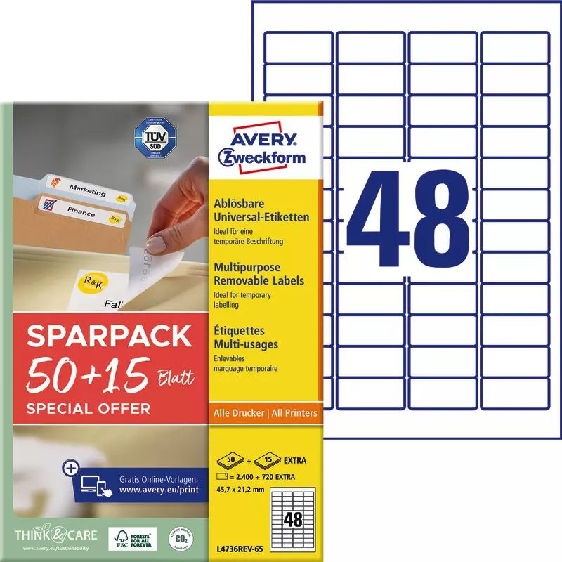 Qualität vom Etiketten-Experten: Mit 15 Blatt EXTRA-Inhalt! Die weißen ablösbaren Etiketten L4736REV-65 im Format 45,7 x 21,2 mm von Avery Zweckform haften sicher auf den verschiedensten Oberflächen und können entfernt werden, ohne Klebstoffrückstände zu hinterlassen. Sie eignen sich sehr gut z.B. zur Beschriftung von Gewürzen (2.400 Etiketten/Pack + 720 Etiketten EXTRA).