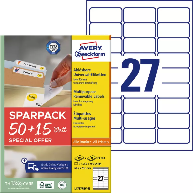 Qualität vom Etiketten-Experten: Mit 15 Blatt EXTRA-Inhalt! Die weißen ablösbaren Etiketten L4737REV-65 im Format 63,5 x 29,6 mm von Avery Zweckform haften sicher auf den verschiedensten Oberflächen und können entfernt werden, ohne Klebstoffrückstände zu hinterlassen. Sie eignen sich sehr gut z.B. als Firmenetiketten oder zum Kennzeichnen von Prospekten (1.350 Etiketten/Pack + 405 Etiketten EXTRA).