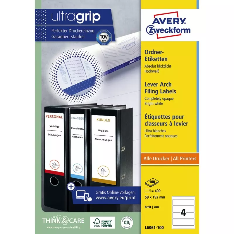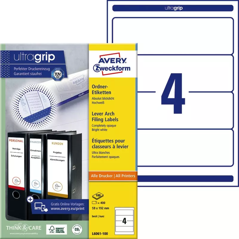 Produktinformationen "AVERY® Zweckform L6061-100 Ordnerrücken-Etiketten, 59 x 192 mm, 100 Bogen/400 Etiketten, weiß"