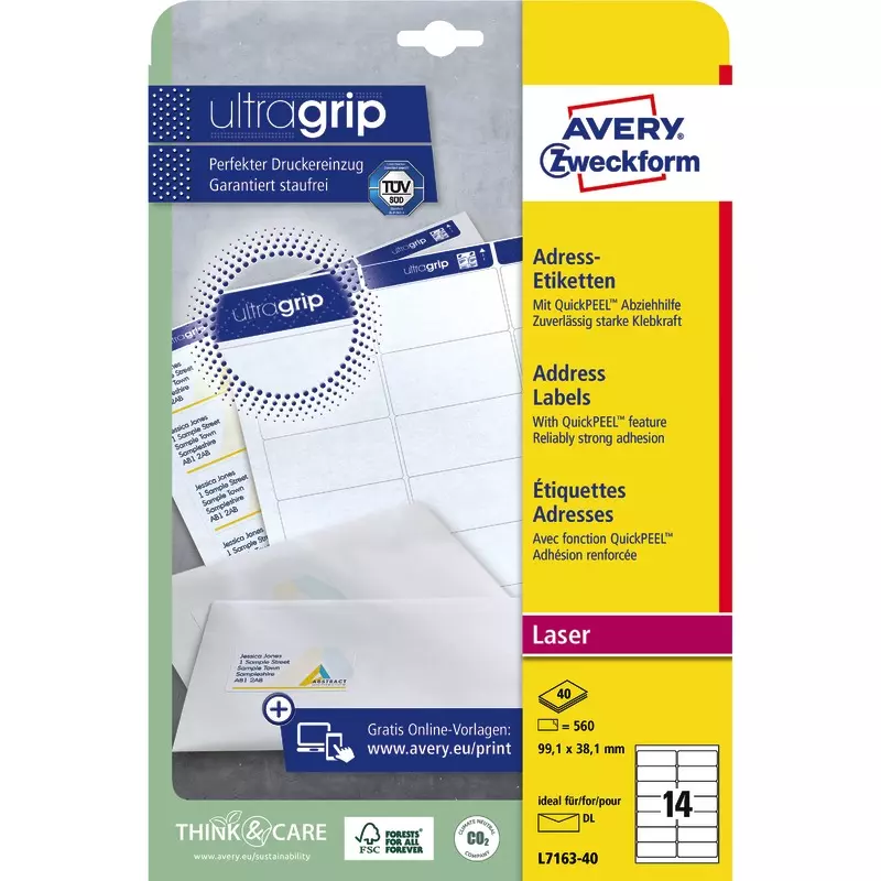 Die Etiketten überzeugen mit einem gestochen scharfem Druckbild und klaren Farben für ein absolut professionelles Auftreten. Die weißen Adressetiketten L7163-40 für Laserdrucker im Format 99,1x38,1mm von AVERY ZWECKFORM eignen sich z.B. zum Adressieren von DIN lang Kuverts. 560 Adressetiketten pro Packung auf 40 Bogen, FSC® zertifiziert. Dank der innovativen ultragrip-Technologie können Sie sich auf einen ultrapräzisen Druckereinzug und absolut staufreien Druckerdurchlauf verlassen.
