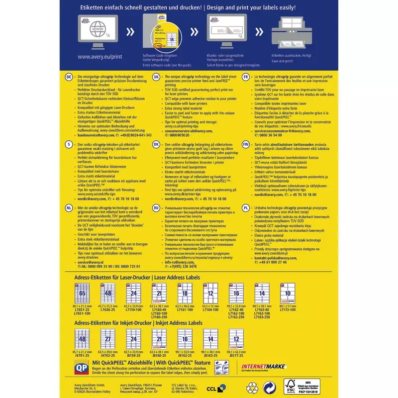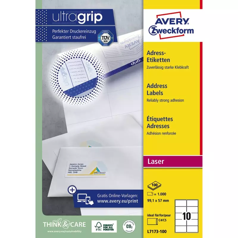 Die Etiketten können dank der angebrachten Abziehhilfe besonders schnell und einfach verarbeitet werden. Die weißen Adressetiketten L7173-100 für Laserdrucker im Format 99,1x57mm von AVERY ZWECKFORM eignen sich z.B. zum Adressieren von C4/C5 Kuverts. Die Etiketten sind auch geeignet für die Internetmarke der Dt. Post under www.internetmarke.de. 1000 Adressetiketten pro Packung auf 100 Bogen, FSC® zertifiziert.