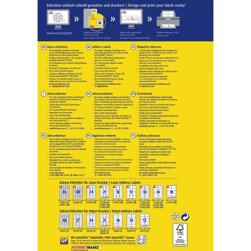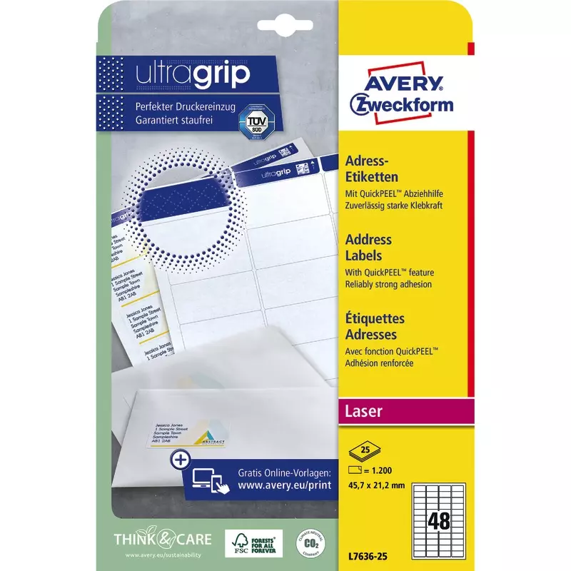 Die weißen Adressetiketten L7636-25 für Laserdrucker im Format 45,7x21,2mm von AVERY ZWECKFORM eignen sich z.B. zur Verwendung als Absender-Etikett. 1200 Adressetiketten pro Packung auf 25 Bogen, FSC® zertifiziert. Dank der innovativen ultragrip-Technologie können Sie sich auf einen ultrapräzisen Druckereinzug und absolut staufreien Druckerdurchlauf verlassen.