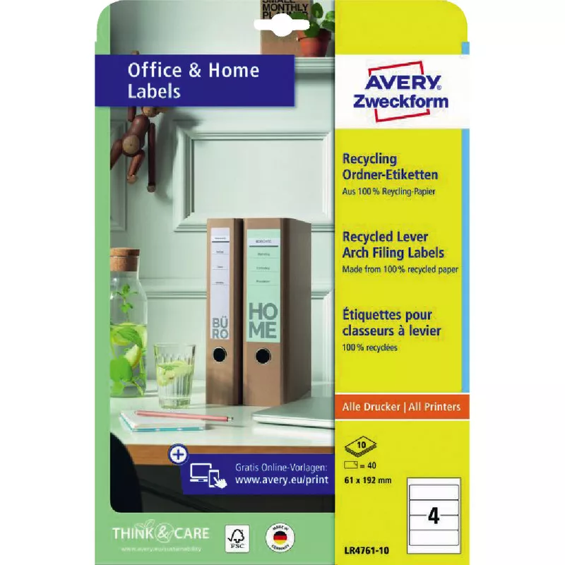 Produktinformationen "AVERY® Zweckform Recycling Ordner-Etiketten LR4761-10, 10 Blatt 61 x 192 mm, Inkjet, Farblaser, Laser s/w, Kopierer, für breite Ordner (kurz), Pack: 40 Stück"