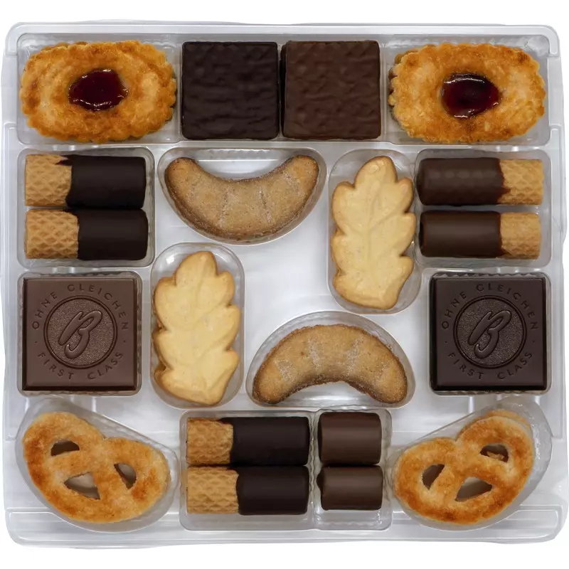 Weizenmehl, Zucker, pflanzliche Fette (Palm), Kakaomasse, Kakaobutter, Haselnüsse, Butter, Invertzuckersirup, Magermilchpulver, Molkenerzeugnis (Milch), Sonnenblumenöl, Butterreinfett, Vollmilchpulver, Hühnervollei, Emulgator: Lecithine; Glukosesirup, Salz, fettarmes Kakaopulver, Milchzucker, Hühnereigelbpulver, geröstetes Gerstenvollkornmehl, Backtriebmittel: Natriumcarbonate, Diphosphate; Johannisbeersaftkonzentrat, Aromen, Dextrose, Stärke (Weizen), Geliermittel: Pektine; Säuerungsmittel: Citronensäure; Sauerkirschsaftkonzentrat, Gewürz, Trennmittel: Magnesiumsalze der Speisefettsäuren. Kann enthalten: Mandeln.