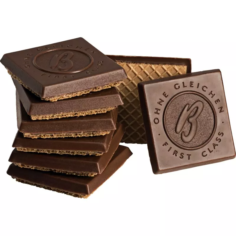 Köstliche edelherbe Schokolade (48 %), feine Nougatcreme-Füllung (35 %) und knusperzarte Waffel. Inhalt: 125 g