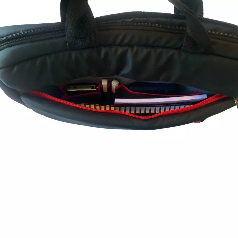 Die Tasche aus weichem Stepp-Außenmaterial in Schwarz mit roten Farbakzenten – innen mit weichem Material ausgestattet – werden Ihre elektronischen Geräte während des Transports gut geschützt.