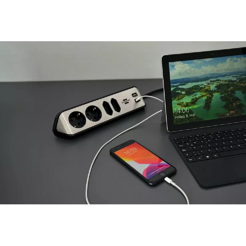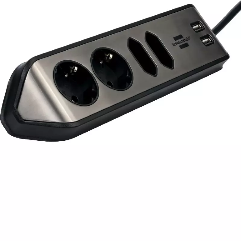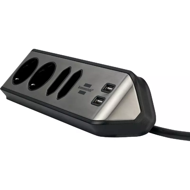 Kompakte brennenstuhl® estilo Eck-Steckdosenleiste aus hochbruchfestem Kunststoff und hochwertiger Edelstahloberfläche. Mit 2 Schutzkontakt-Steckdosen, 2 Euro-Steckdosen und USB-Ladefunktion.