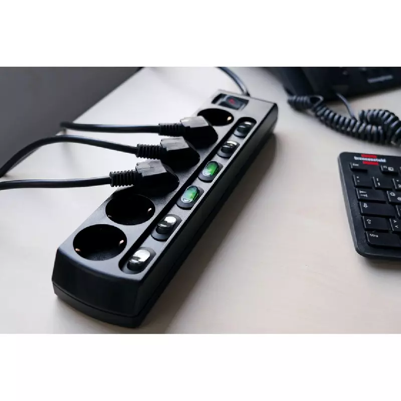 - Alle Schalter der einzeln schaltbaren Steckerleiste sind beleuchtet und dienen somit zur schnellen und sicheren Kontrolle