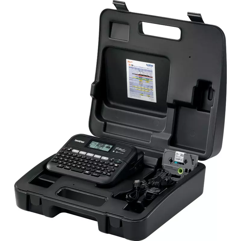- Inklusive Schriftbandkassette, Netzadapter, Transportkoffer und USB-Kabel