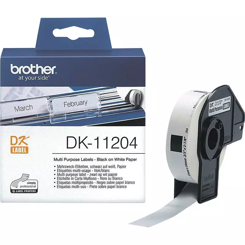 Etiketten für brother P-Touch QL-Etikettendrucker. Die Original Brother DK-11204 Einzeletikettenrolle mit schwarzer Schrift auf weißem Hintergrund ist perfekt für Ihren allgemeinen Beschriftungsbedarf geeignet.