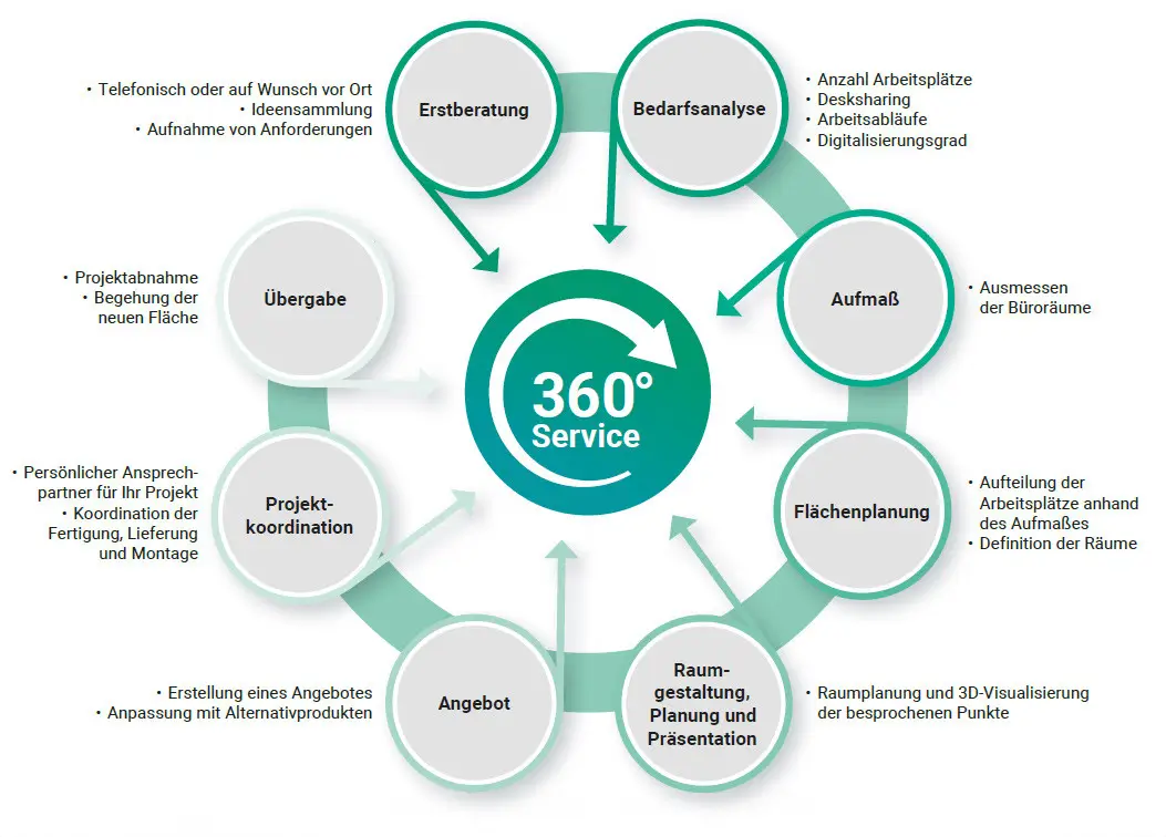 Von der persönlichen Erstberatung bis zur Übergabe der neuen Räume – wir übernehmen alle Schritte, so dass Sie sich auf Ihr Kerngeschäft konzentrieren können. Alle Arbeitsschritte dienen dazu ein individuelles Raumkonzept zu gestalten, dass zu Ihrem Kostenrahmen passt. In unserem Portfolio können wir dazu auf hochwertige, moderne Möbel zugreifen, die ein ergonomisches Arbeiten ermöglichen.
