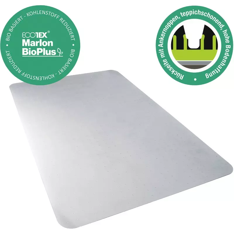 Hohe Langlebigkeit und Transparenz zum Schutz Ihrer Böden vor Bürostuhlrollen, allgemeinem Verschleiß, Kratzern und verschütteten Flüssigkeiten. Am Ende der Lebendauer effizient recycelbar,