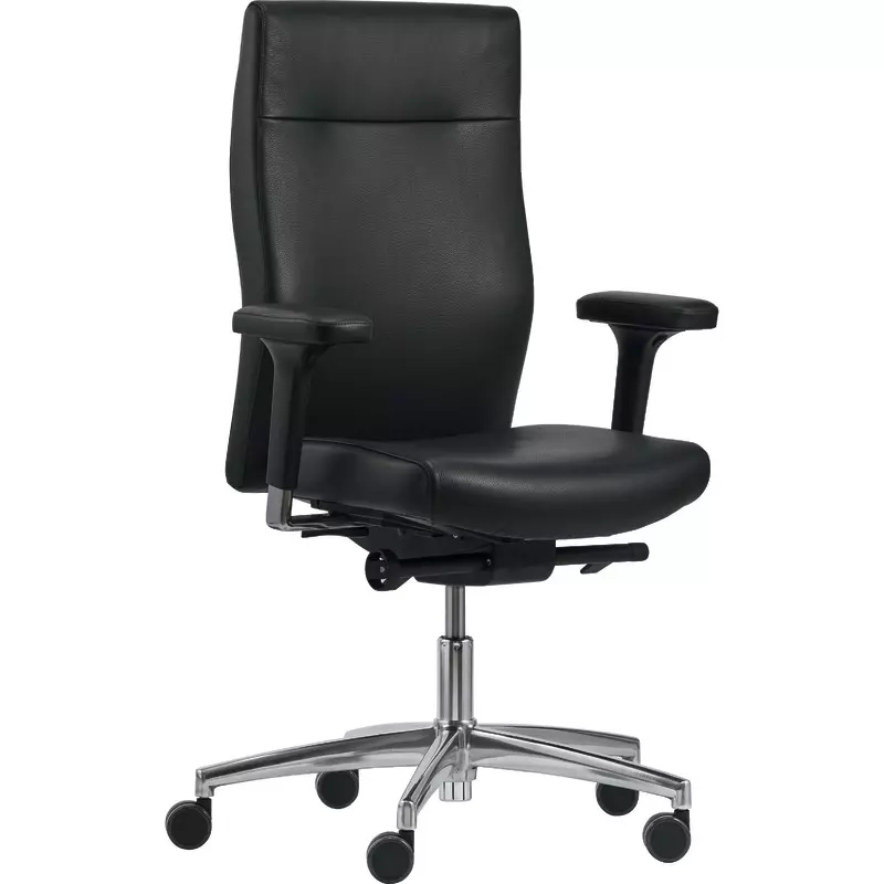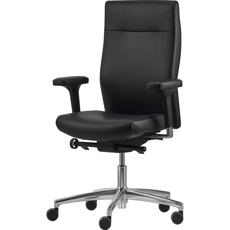 Mit seinem Echtleder-Bezug, den multifunktionalen 4F-Armlehnen und dem edlen Aluminium-Fußkreuz erfüllt er auch höchste Ansprüche.