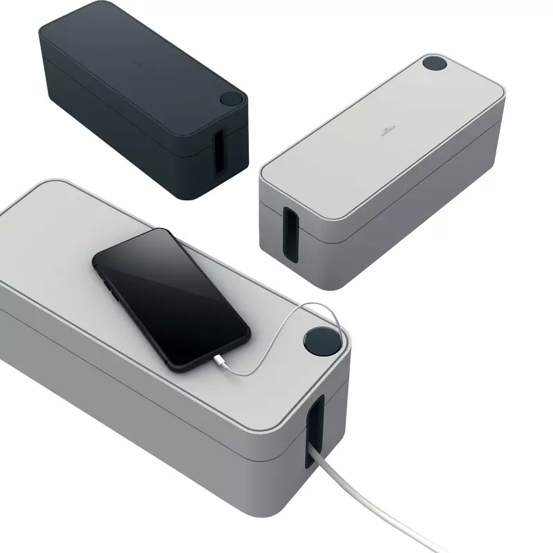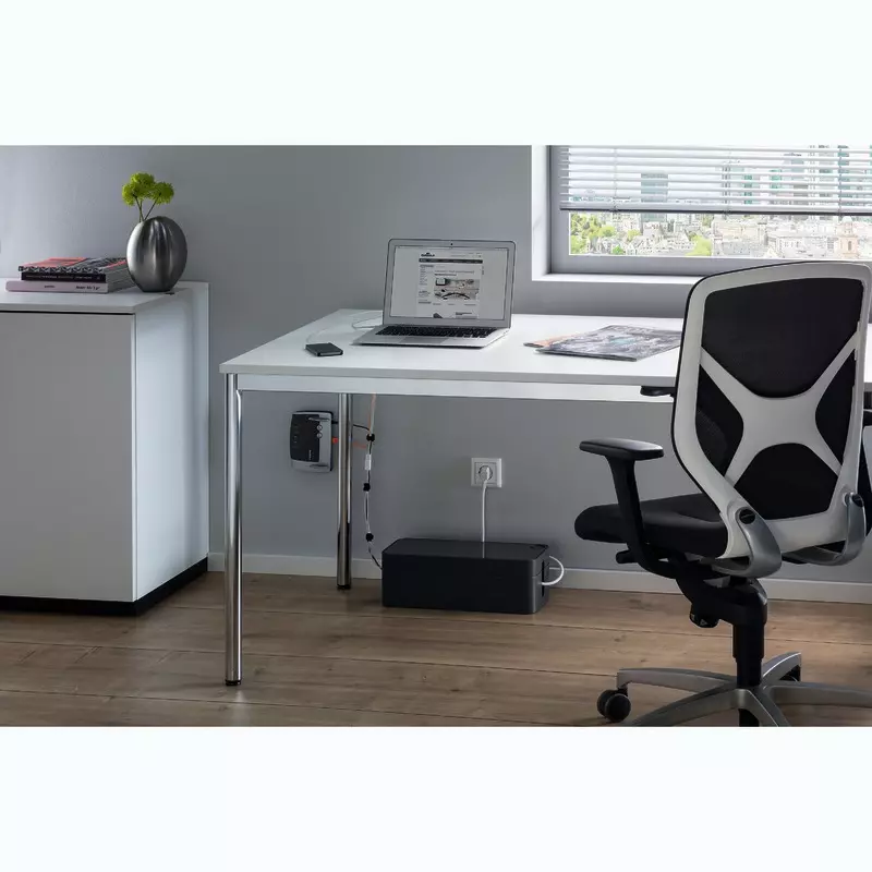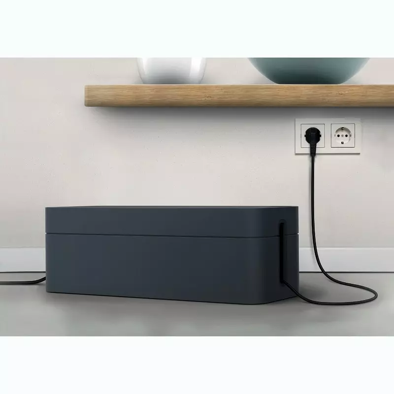 Elegante Kabelbox für ein einfaches und sicheres Kabelmanagement. Zur Aufnahme von Kabeln und 5-fach Steckdosenleiste.