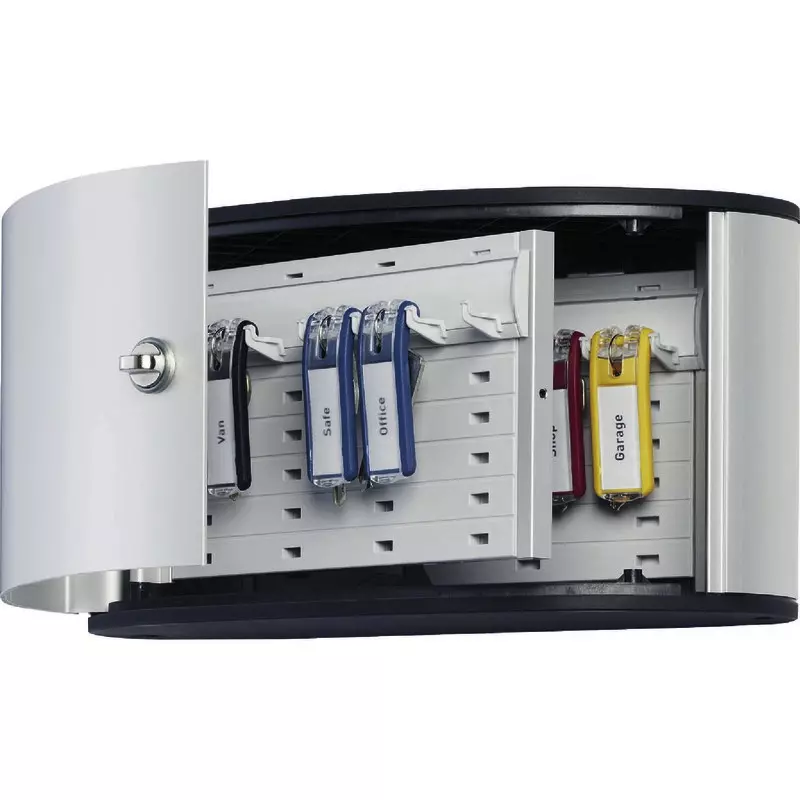 Permanent sichtbares Beschriftungsfeld bei den Schlüsselanhängern KEY CLIP, da der Schlüssel flach dahinter liegt. Leichter Zugriff, die Tür lässt sich durch einen praktischen Drehverschluss um mehr als 90° öffnen. Einfach an die Wand zu schrauben.