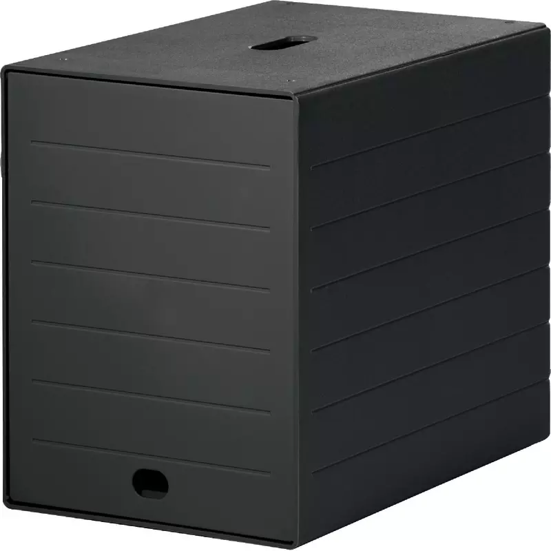 Schubladenbox mit sieben offenen Schubladen und versenkbarer Frontplatte für die Aufbewahrung von schriftlichen Unterlagen bis Format DIN C4.