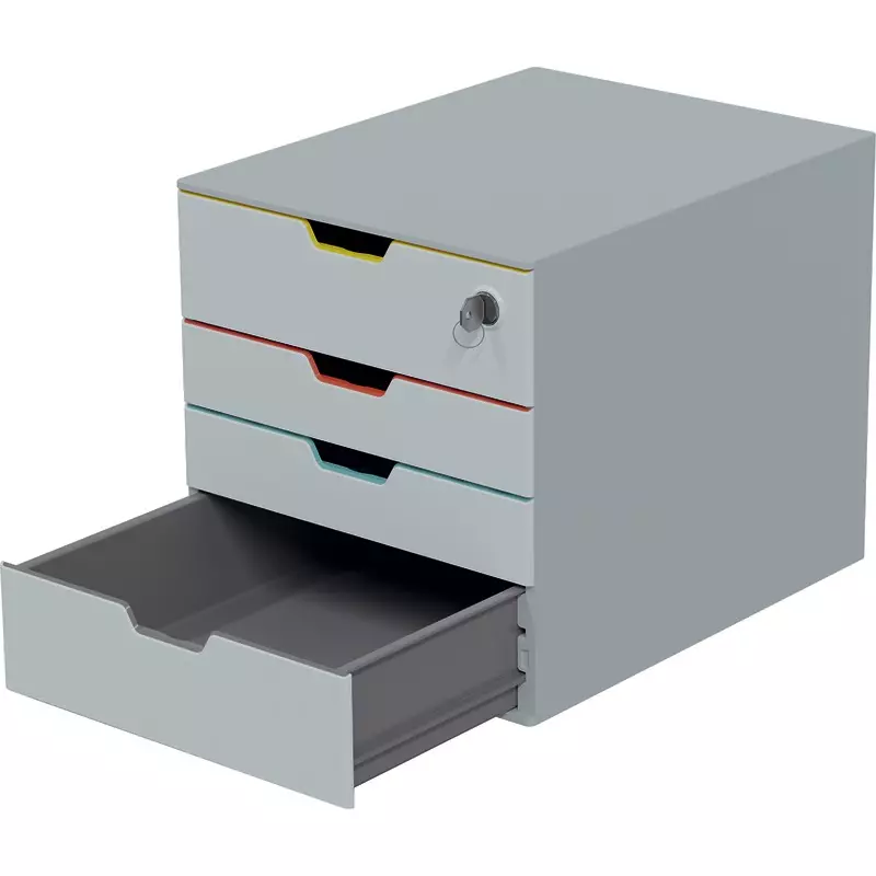 Abschließbare Schubladenbox mit vier farbigen Schubladen als Organisations- und Orientierungshilfe und zwei XXL-Schubladen mit besonders viel Stauraum.