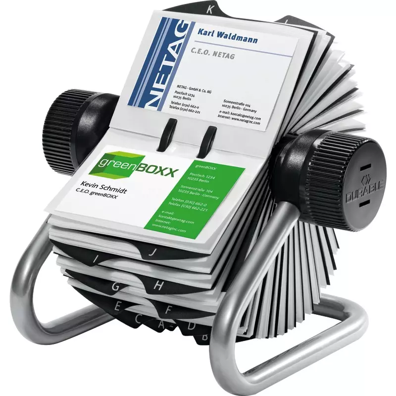 Die Visitenkarten-Rollkartei ist ideal zum übersichtlichen Aufbewahren von bis zu 400 Visitenkarten. Die Karten bleiben durch den Drehmechanismus an jeder gewünschten Position stehen.