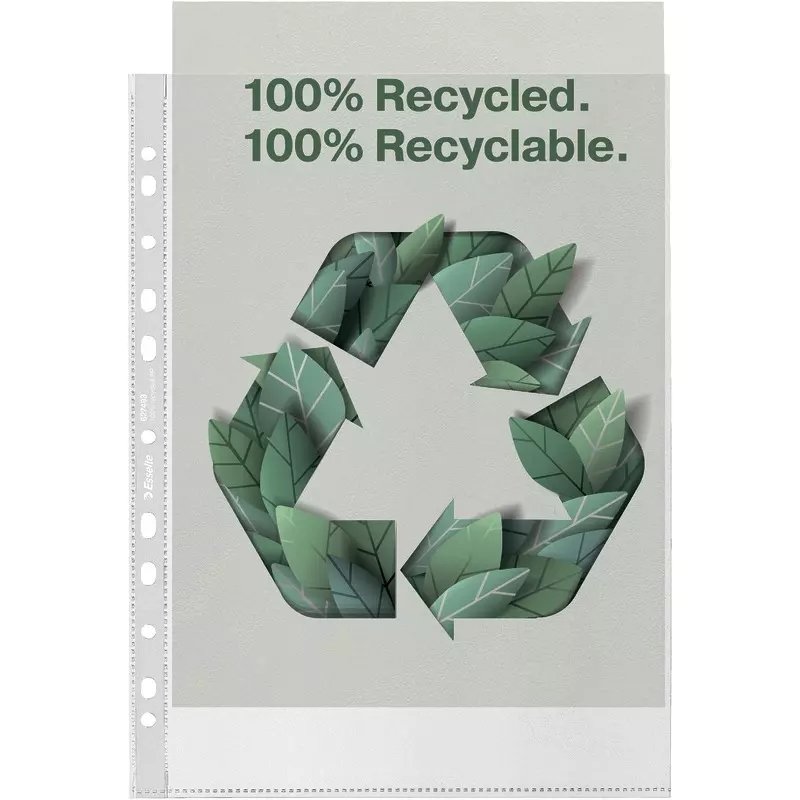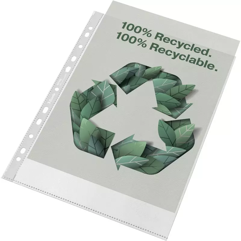 Umweltfreundliche Prospekthülle im Format A4 für den täglichen Gebrauch aus stabiler, 100% recycelter PP-Folie Dank der Universallochung kann die Hülle bequem im Ordner oder Ringbuch abgelegt werden. Das gesamte Produkt kann wiederverwendet und erneut recycelt werden. Auch die Kartonverpackung besteht zu 100% aus recyceltem Material und ist recycelbar. Hergestellt in Europa.