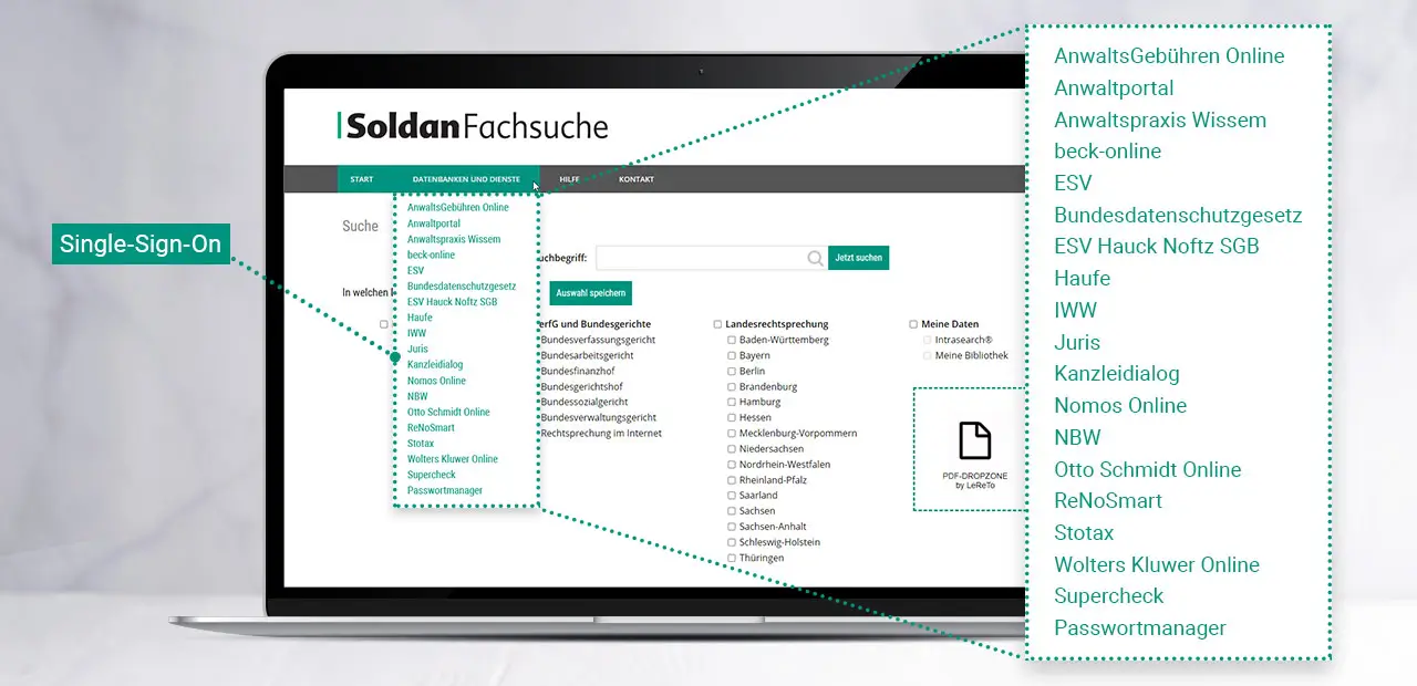 Mit unserem Single-Sign-On nutzen Sie auf direktem Wege alle Datenbanken und Dienste im Internet, die Sie über Soldan gebucht haben. Und das, ohne sich nochmals anmelden zu müssen.