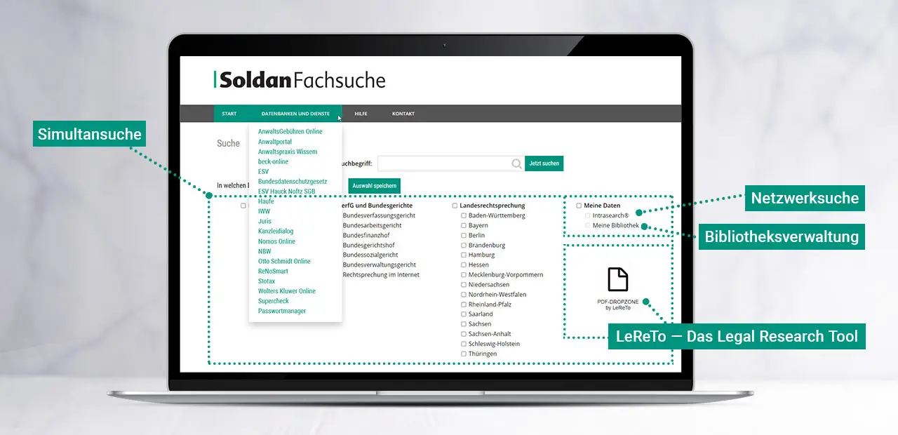 Die SoldanFachsuche ist Ausgangspunkt für jede juristische oder steuerrechtliche Recherche. Sie vereint den Zugang zu Online-Datenbanken, die Simultansuche in ausgesuchten Quellen und eine Online-Bibliotheksverwaltung in einem Portal.