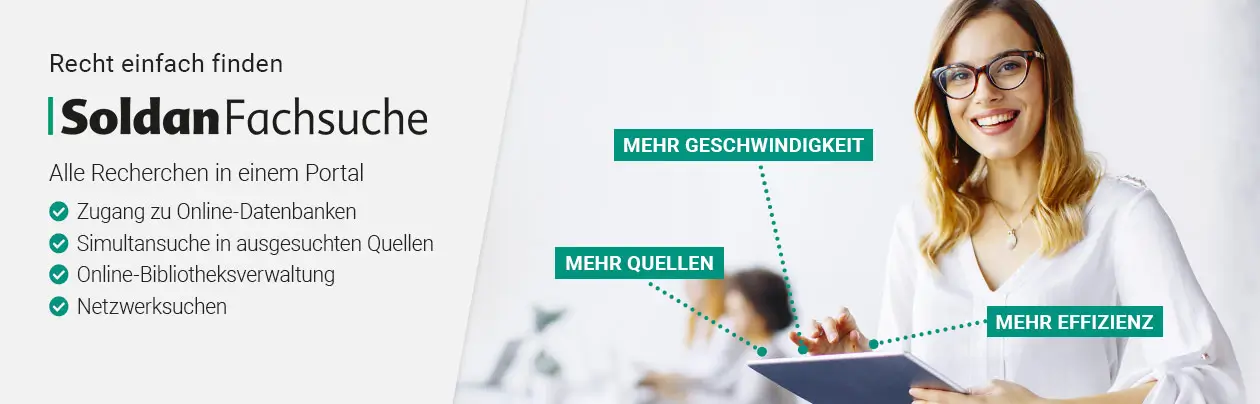 Für die Nutzung der Soldan Fachsuche benötigen Sie lediglich ein Soldan Online-Konto. Haben Sie dazu Fragen oder wünschen Beratung? Sprechen Sie uns an - wir beraten Sie gerne. Telefonisch unter 0201 8612 380 oder per E-Mail an datenbanken@soldan.de.