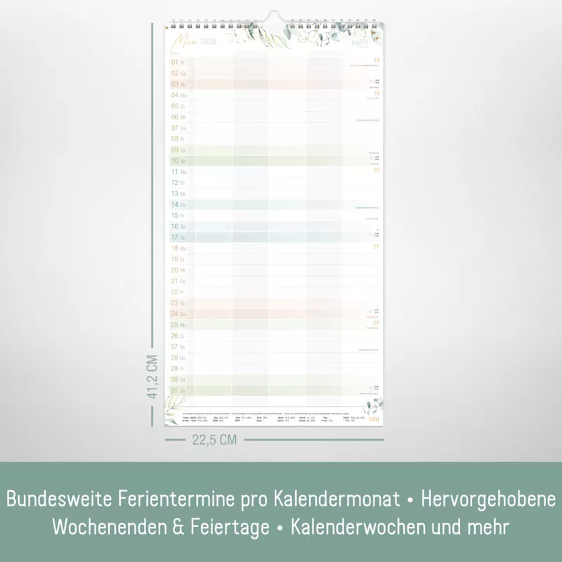 Wandkalender im Format 22,5 x 42 cm mit fünf Spalten – ideal für