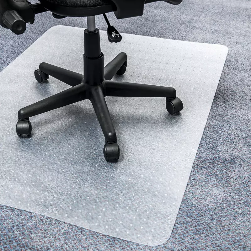 Umweltfreundliche Bodenschutzmatten aus Polymer mit einem Recyclinganteil von bis zu 50 %. Mit rückseitigen Ankernoppen für festen Halt auf Teppichböden bis 9 mm.
