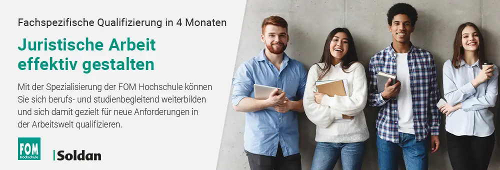 Sie interessieren sich für die FOM Spezialisierung "Legal Tech" in Kooperation mit der Hans Soldan GmbH? Sie erhalten weitere Informationen sowie die Möglichkeit zur Anmeldung auf der Homepage der FOM Hochschule: