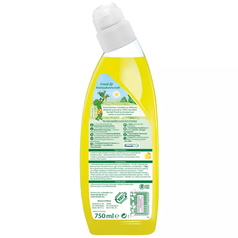Naturbasierte Materialien. Der Frosch Zitronen WC-Reiniger entfernt dank seiner kraftvollen Rezeptur mit Zitronensäure optimal Kalkrückstände, Urinstein und Schmutz und sorgt für eine rundum gründliche Sauberkeit im WC. Der WC-Reiniger beseitigt zudem unangenehme Gerüche und hinterlässt einen angenehmen frischen Duft. Außer Reichweite von Kindern aufbewahren. Nicht mit anderen Produkten mischen. Nicht auf Marmor oder andere säureempfindliche Materialien spritzen. Inhaltsstoffe aus europäischem Anbau. Inhaltsstoffe: Aqua, Citric Acid, Monosodium Citrate, Sodium Laureth Sulfate, Xanthan Gum, Dipropylene Glycol, Parfum, Amide Polyglycol Ether, Citrus Medica Limonum Flower/Leaf/Stem Extract, Colorant. · Inhalt: 0,75 l · Werbliche Produkttypbezeichnung: WC-Reiniger · Biozid-Produkt: Nein · Typbezeichnung des Duftes: Zitrone · parfümiert: Nein · biologisch abbaubar: Ja · frei von Mikroplastik: Ja · pH-Wert: 2,5 · Ausführung des Behälters: Flasche · Material des Behälters: 100 % Altplastik