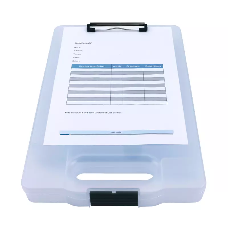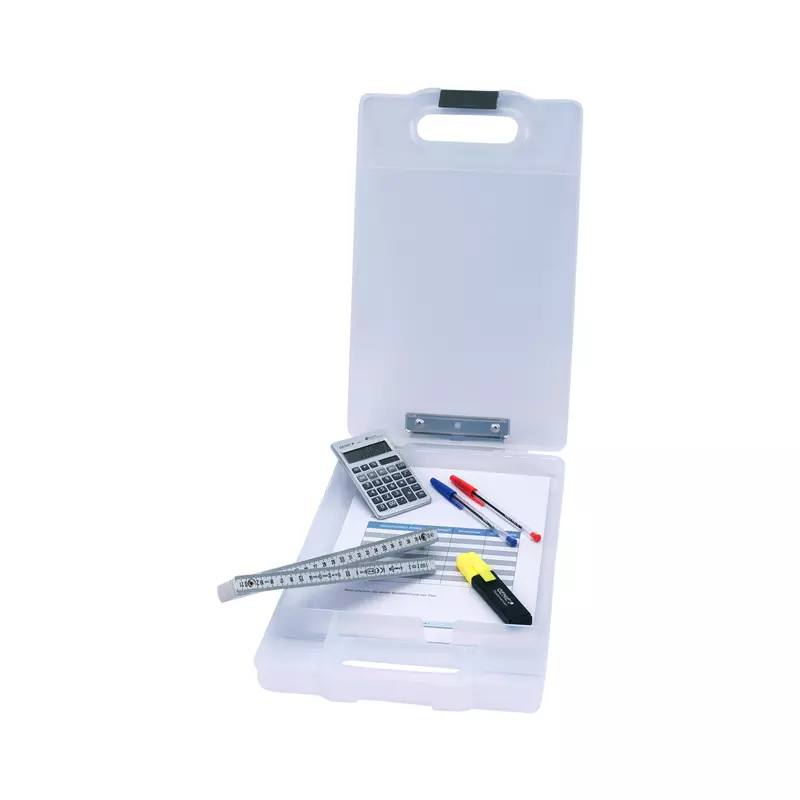Klemmbrett mit großem Aufbewahrungsfach für den professionellen Einsatz. Das große Aufbewahrungsfach mit einer Füllhöhe von 34 mm dient als Organizer und bietet viel Platz und Schutz für Tablet, Handy, Formulare, weitere Papiere, Taschenrechner etc. Separate Fächer im Inneren dienen als Kleinteile-Box zur Aufbewahrung von z.B. Kugelschreiber, Bleistifte, Büroklammern etc. Der Clip im Griff verschließt das gesamte Aufbewahrungsfach. · Farbe: transparent · Produkttypbezeichnung: CL 900 · Werbliche Produkttypbezeichnung: Klemmbrett CL 900 · Maße: 25 x 40,8 x 4,6 cm (B x H x T) · Für Papierformat: DIN A4 · Anordnung der Lage (Klemme): kurze Seite · abgerundete Ecken vorhanden: Ja · Gewicht: 472 g · Werkstoff: Kunststoff · Material der Klemme: Metall