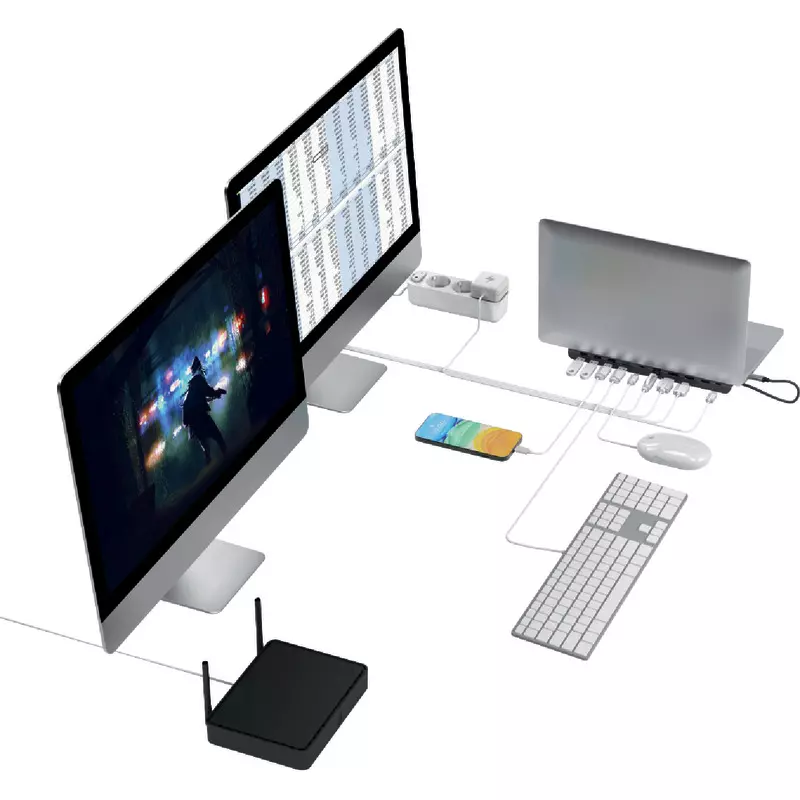 Jetzt arbeiten Sie im Homeoffice so komfortabel wie im Büro. Mit zwei großen Bildschirmen, LAN-Anschluss, Tastatur und mehr. Sie richten Ihren Arbeitsplatz einmal ein und müssen dann einfach nur den Hub an Ihrem Notebook anstecken, schon sind Sie startklar.