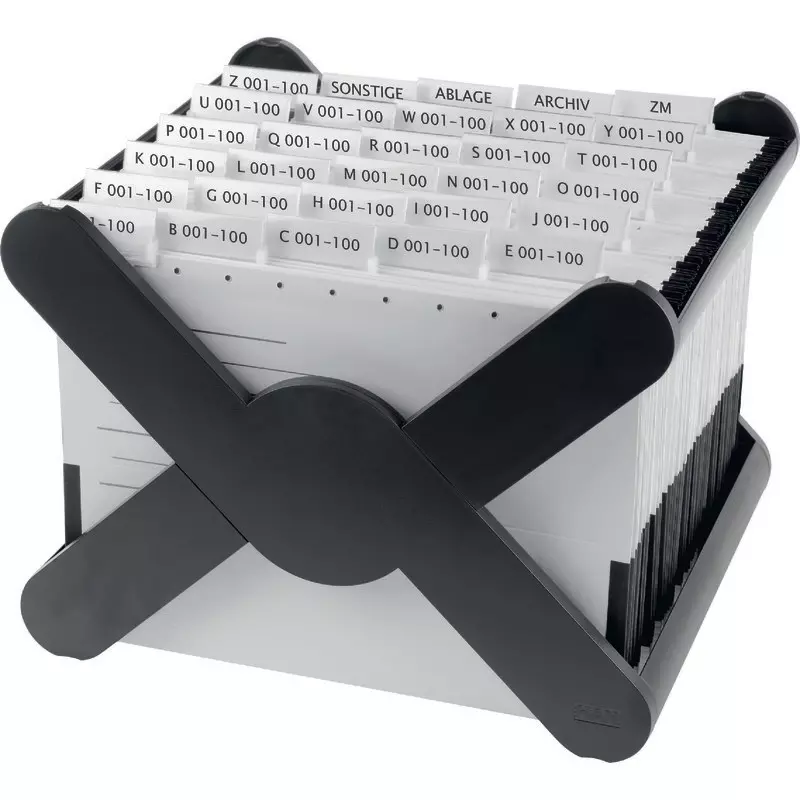 Stabiles, rutschfestes Kunststoffgestell für bis zu 35 Hängemappen, geeignet für den Schreibtisch, in Containern oder Schränken.