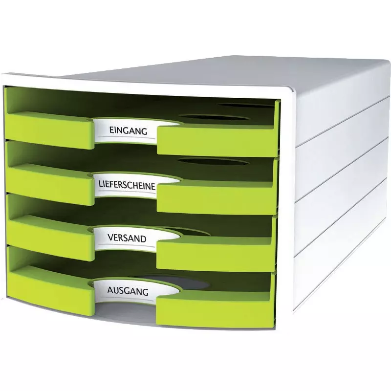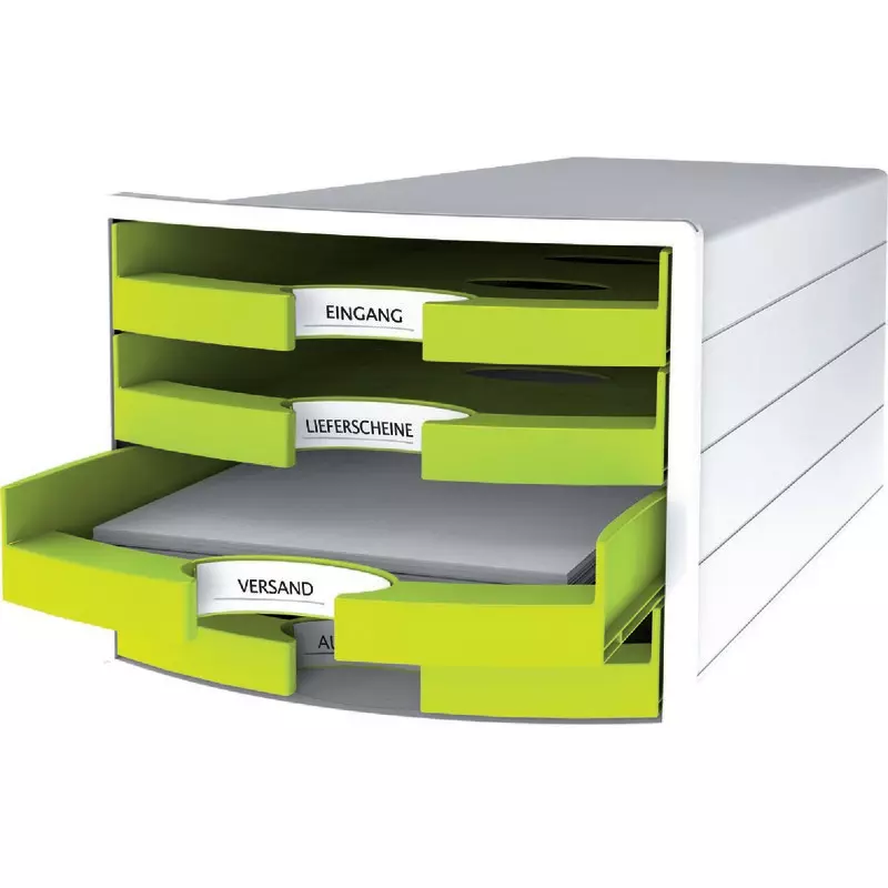 Moderne Optik für Ihre Organisation! Stabile Schubladenbox mit vier offenen Schüben für Unterlagen bis DIN C4. Mit einem großen auswechselbaren Beschriftungsfenster.
