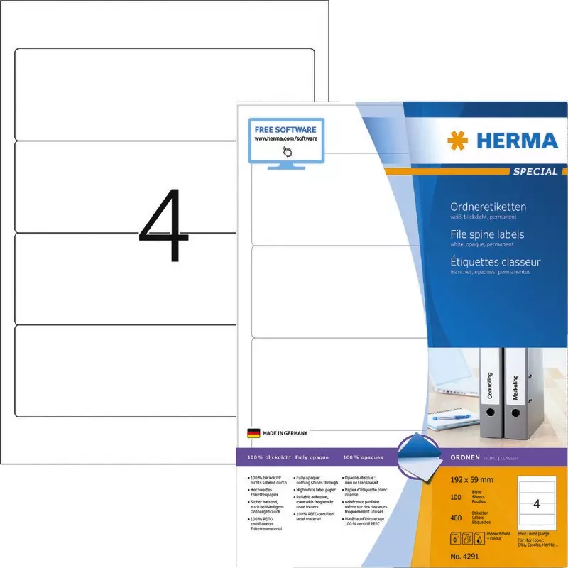Produktinformationen "HERMA Ordneretiketten 4291, DIN A4, 192 x 59 mm, weiß Papier, matt, blickdicht,400 St."