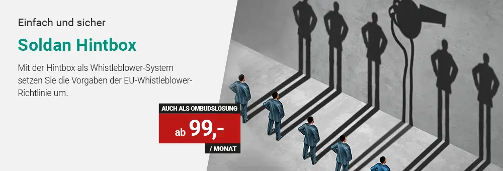 Wir bieten auch eine Ombudslösung an, wenn Sie als Ombudsperson oder externer Compliance Officer für Ihre Mandanten agieren. Weitere Informationen finden Sie hier: www.soldan.de/hintbox-partner-werden.