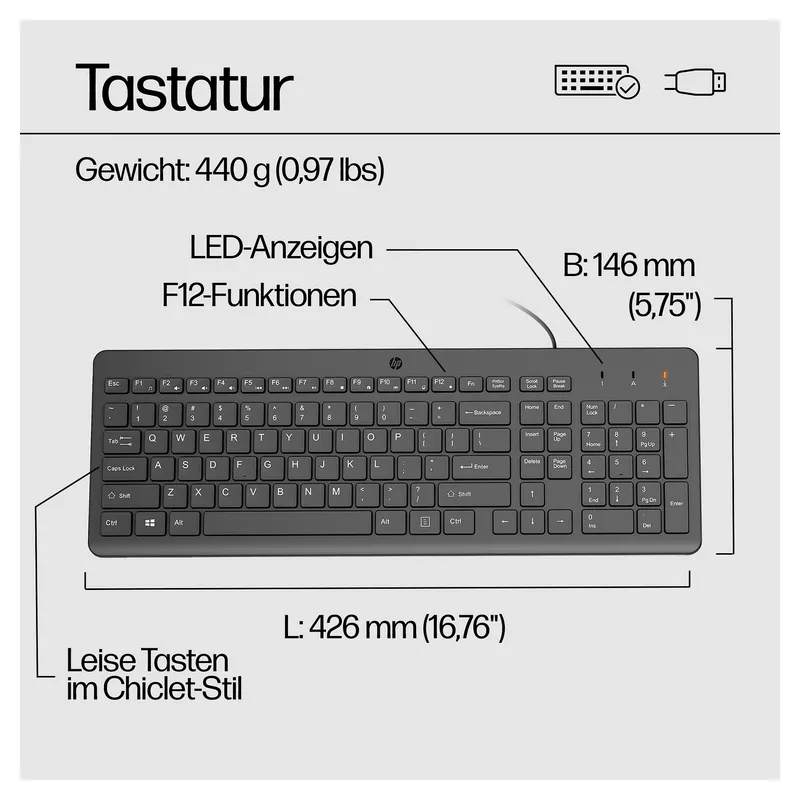 HP 150 Maus und Tastatur (kabelgebunden). Tastatur Formfaktor: